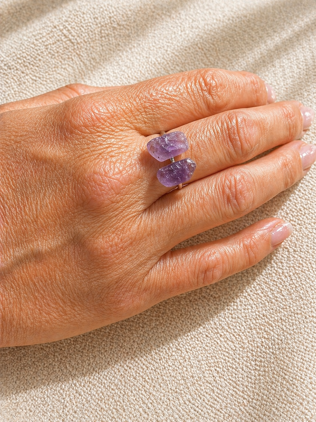 Bague en améthyste brute, idéale pour sérénité, intuition et élévation spirituelle.