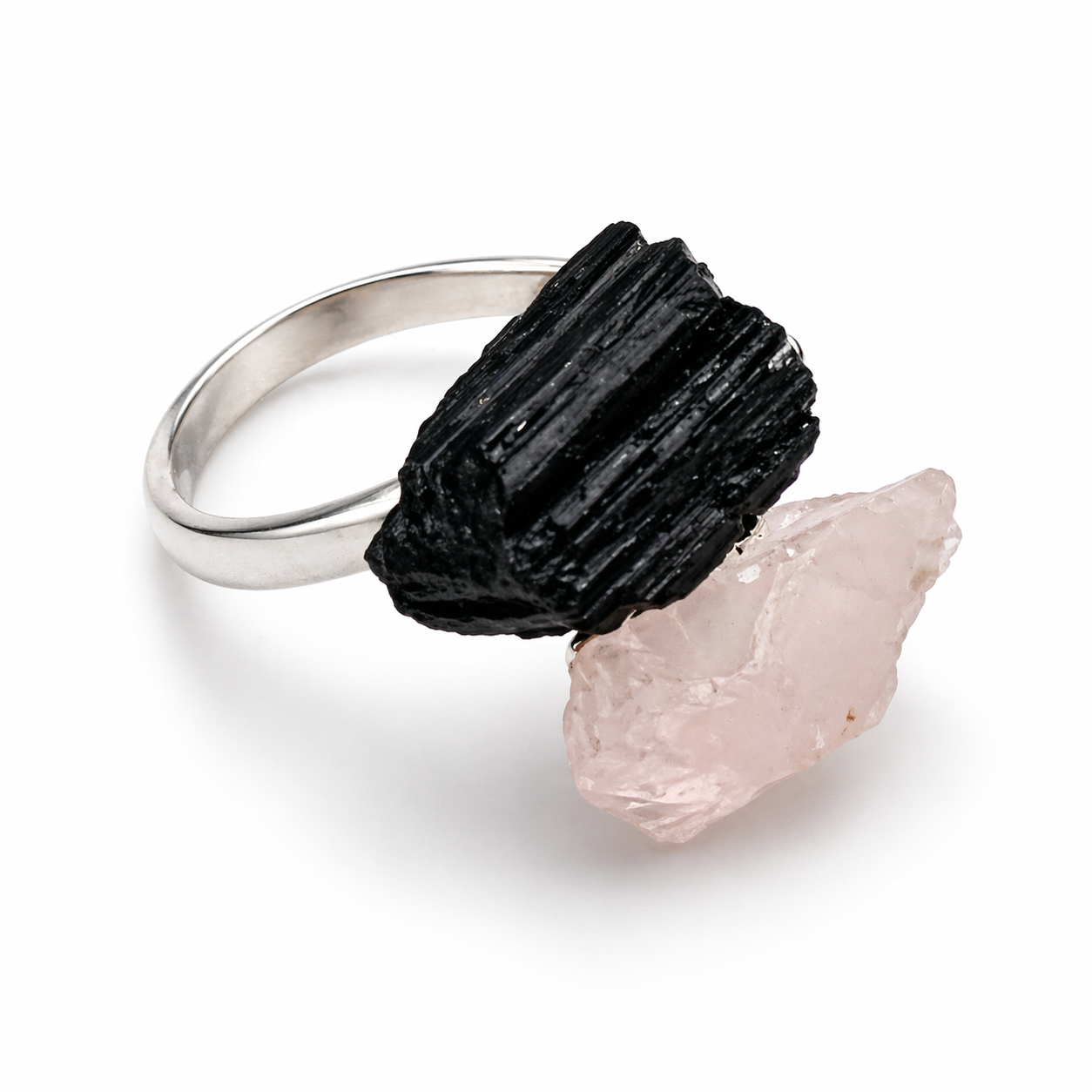 Bague en quartz rose et tourmaline, idéale pour amour, protection et équilibre.