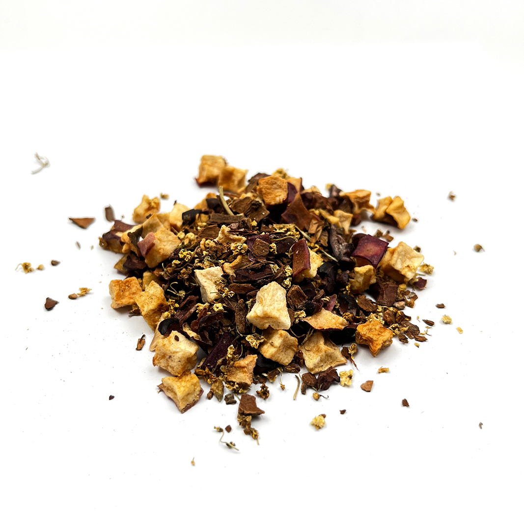Dans cette composition, chaque plante porte un message : le cacao invite à se relier à ses ressentis les plus fins, la cannelle éclaire ce qui est flou, le sureau ouvre les canaux intuitifs, et la pomme ramène à la sagesse douce et simple du cœur. À chaque dégustation, l’infusion devient un rituel de reconnexion profonde, un moment où les voiles se lèvent, où les pensées se clarifient et où l’intuition retrouve sa voix.