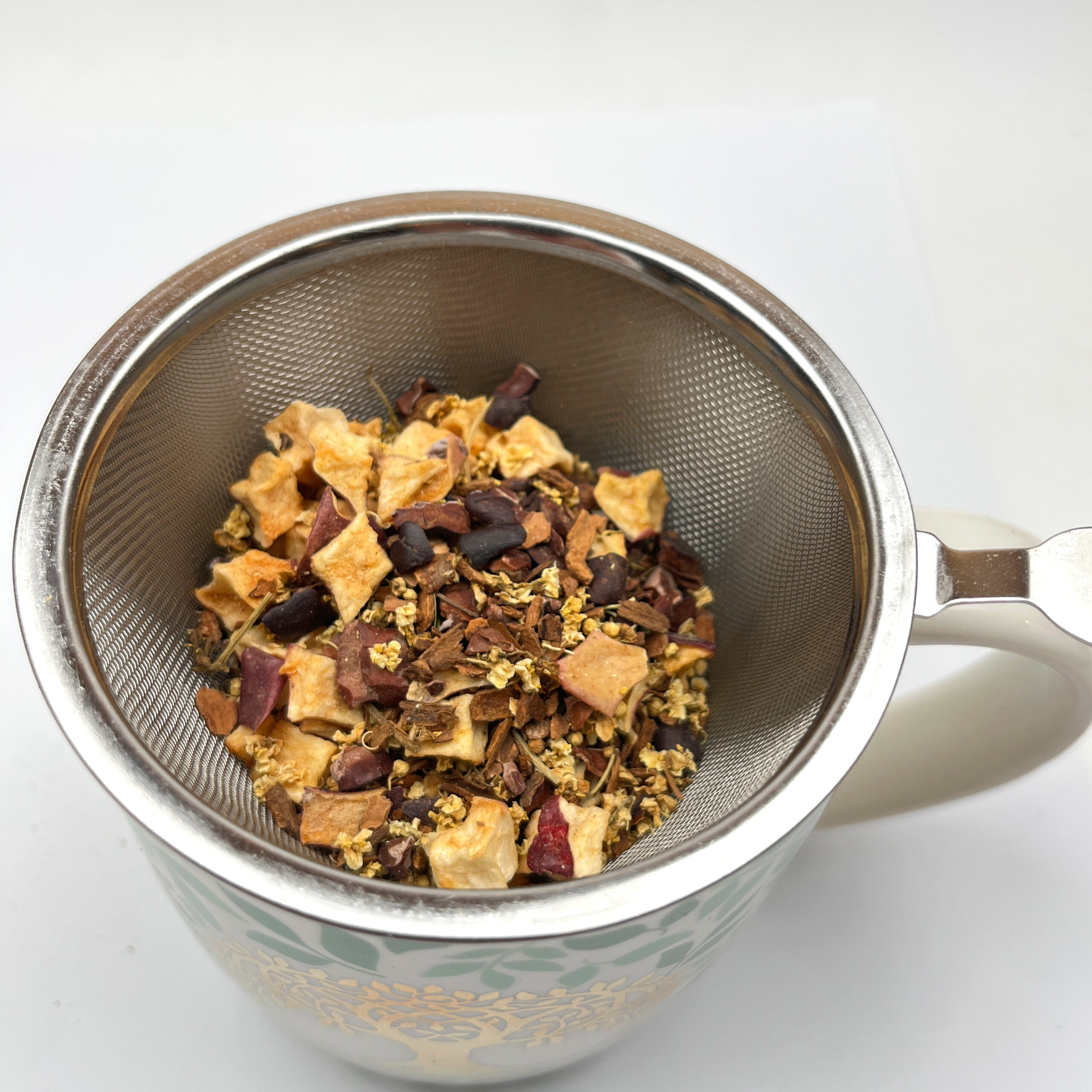 Traditionnellement, le cacao grué est associé à l’ouverture du cœur et à l’écoute intérieure, la cannelle évoque le feu du discernement, les fleurs de sureau symbolisent la perception subtile, et la pomme, fruit des traditions anciennes, représente la connaissance intuitive. Ces symboliques donnent à cette infusion un caractère profondément cérémonial, presque chamanique, comme un breuvage destiné à réveiller les sens intérieurs.