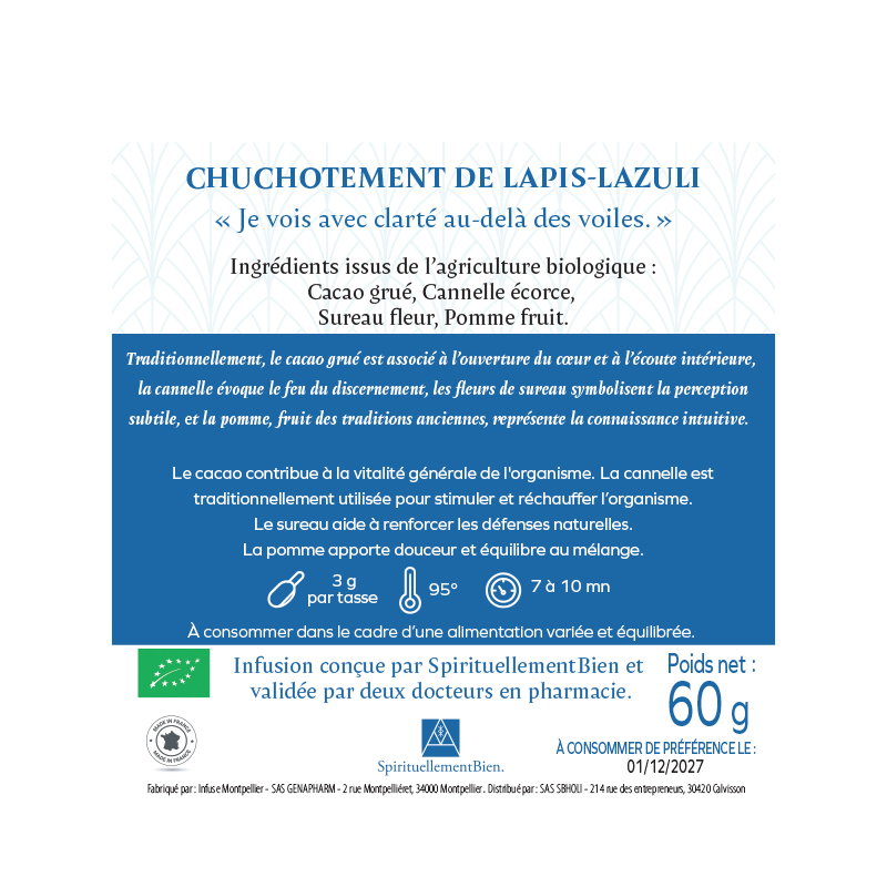 L’infusion bio Chuchotement de Lapis-Lazuli est une création SpirituellementBien conçue pour éveiller le chakra du 3ᵉ œil, développer la clarté intérieure et soutenir l’intuition profonde. Bien qu’elle ne contienne pas physiquement de Lapis-Lazuli, elle s’inspire de son énergie sacrée : vision intérieure, sagesse intuitive, discernement et connexion subtile. Chaque gorgée est pensée comme un moment d’ouverture, où les perceptions s’affinent, où l’esprit s’apaise, et où les messages intérieurs deviennent plus clairs. Cette infusion bio est une invitation à voir au-delà du visible, à écouter l’intuition qui murmure, à ressentir ce qui se joue dans les profondeurs de soi. Elle accompagne les méditations, les tirages intuitifs, les moments de créativité, de visualisation ou d’intégration émotionnelle.