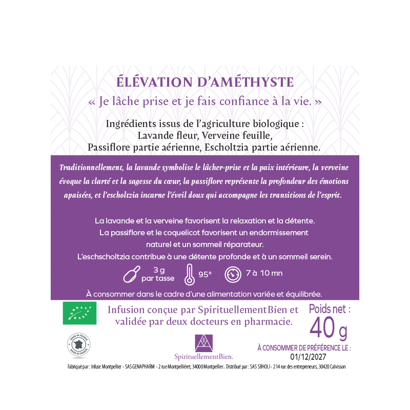 L’herboristerie considère depuis toujours ces plantes comme de puissantes alliées du calme et de la détente. La lavande accompagnait les rituels du soir chez les peuples méditerranéens, la verveine soutenait les rites de clarté et de sagesse, la passiflore apaisait les esprits agités dans les traditions amérindiennes, tandis que l’escholtzia guidait vers un sommeil réparateur. Élévation d’Améthyste perpétue cet héritage en l’intégrant dans une infusion moderne, vibrante et profondément spirituelle.