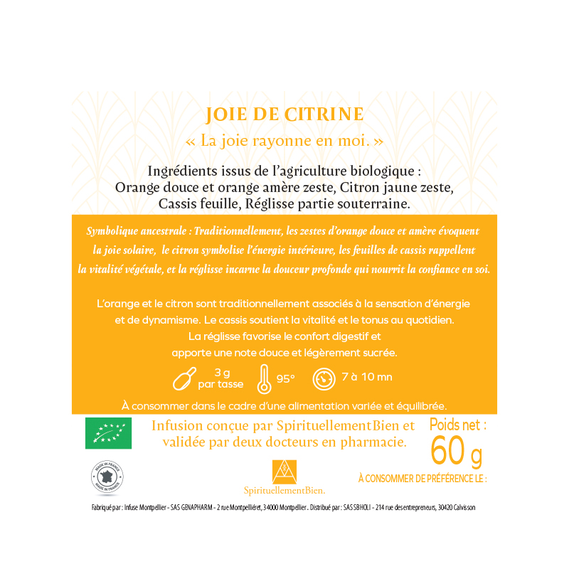 L’infusion bio Joie de Citrine est une création SpirituellementBien conçue pour raviver l’énergie solaire, encourager la confiance en soi et nourrir la joie intérieure. Même si elle ne contient pas physiquement de Citrine, elle s’inspire profondément de sa vibration lumineuse : optimisme, clarté mentale, élan personnel et puissance intérieure. Chaque gorgée illumine le chakra du plexus solaire, renforce la vitalité émotionnelle et apporte une sensation immédiate de chaleur bienveillante et de positivité.