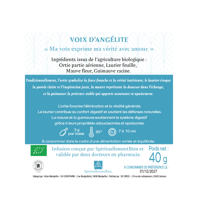 L’infusion bio Voix d’Angélite est une création SpirituellementBien conçue pour soutenir le chakra de la gorge, favoriser une communication fluide et permettre l’expression authentique de soi. Inspirée de l’énergie douce et rassurante de l’Angélite – pierre associée à la parole juste, à la sérénité et à la vérité intérieure –, cette infusion n’en contient pas physiquement mais en porte l’intention vibratoire. Chaque gorgée agit comme une caresse apaisante qui libère les tensions, facilite l’expression émotionnelle et adoucit les moments où l’on peine à dire ce que l’on ressent.